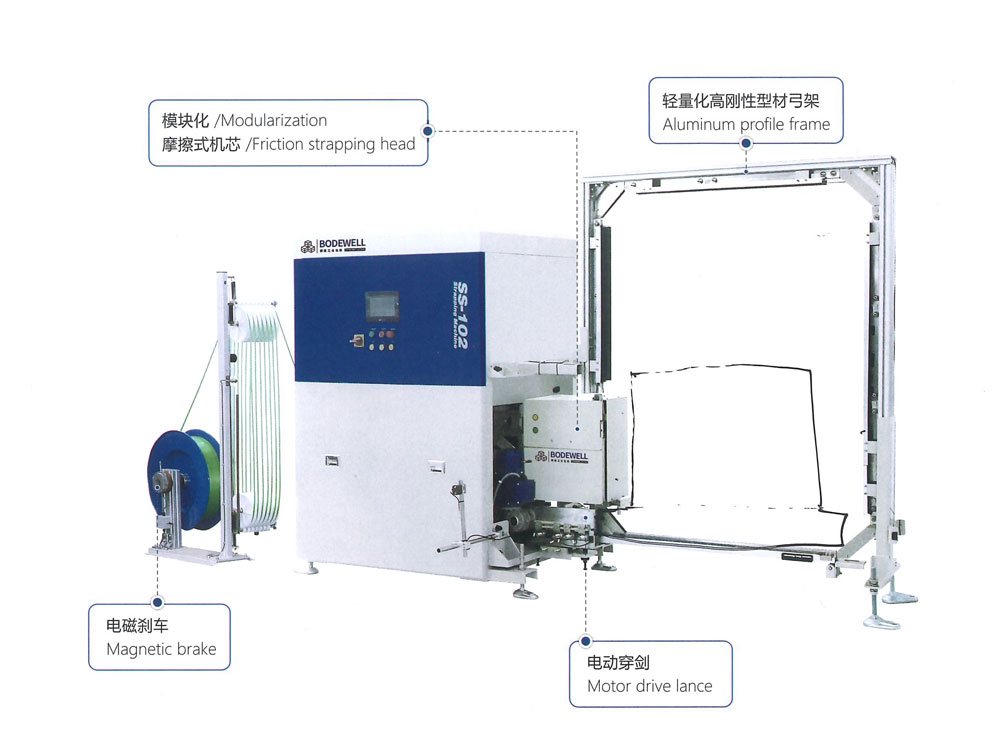 ● 可移動穿劍式側面捆扎機是側面穿劍式捆扎機的衍生機型,適用于貨物在固定工位,設備移動來實現多條打帶的場景。