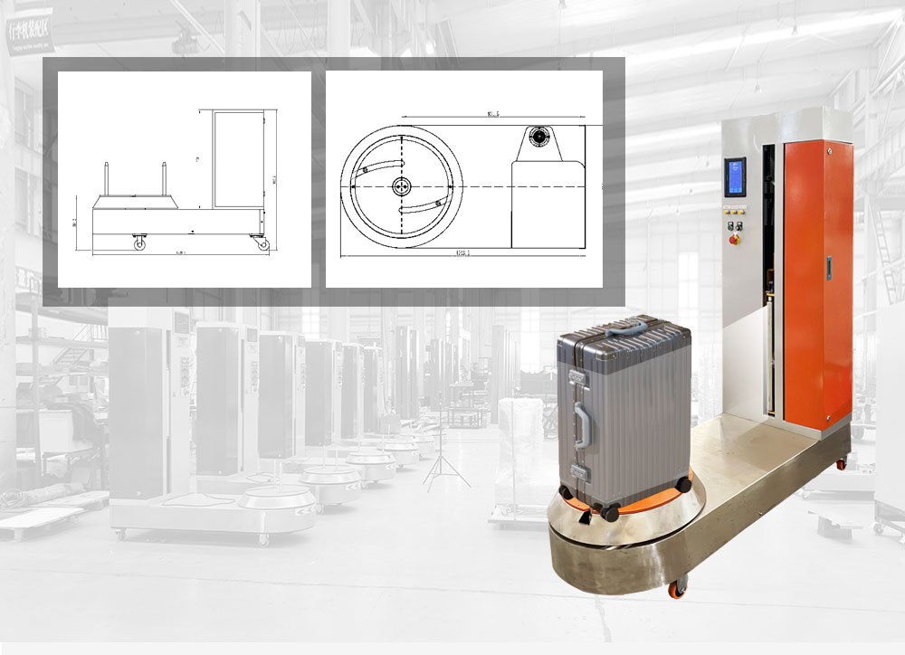 設備可以移動,操作人員將行李放到轉臺上,并根據行李的大小來調節垂直桿,從而使行李可以平穩的放在轉臺上。