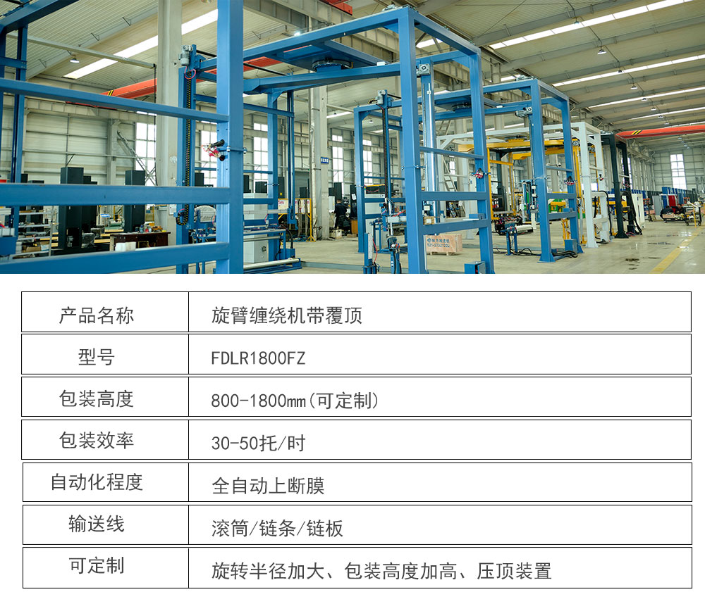 大宏佳森旋臂纏繞機(jī)帶覆頂FDLR1800FZ主要適用于生產(chǎn)量大、包裝效率較高的現(xiàn)代化作業(yè),包裝成本低、效率高滿足貨物的包裝要求。可根據(jù)不同的產(chǎn)品和現(xiàn)場(chǎng)的實(shí)際需求,定制不同的包裝系統(tǒng),自動(dòng)完成貨物的感測(cè)、包裝輸送等全過程,輸送系統(tǒng)可采用滾筒、鏈條、鏈板等不同的形式,自動(dòng)上斷膜機(jī)構(gòu)可實(shí)現(xiàn)無人化操作。廣泛應(yīng)用于食品、飲料、化工、造紙、建材等行業(yè)。