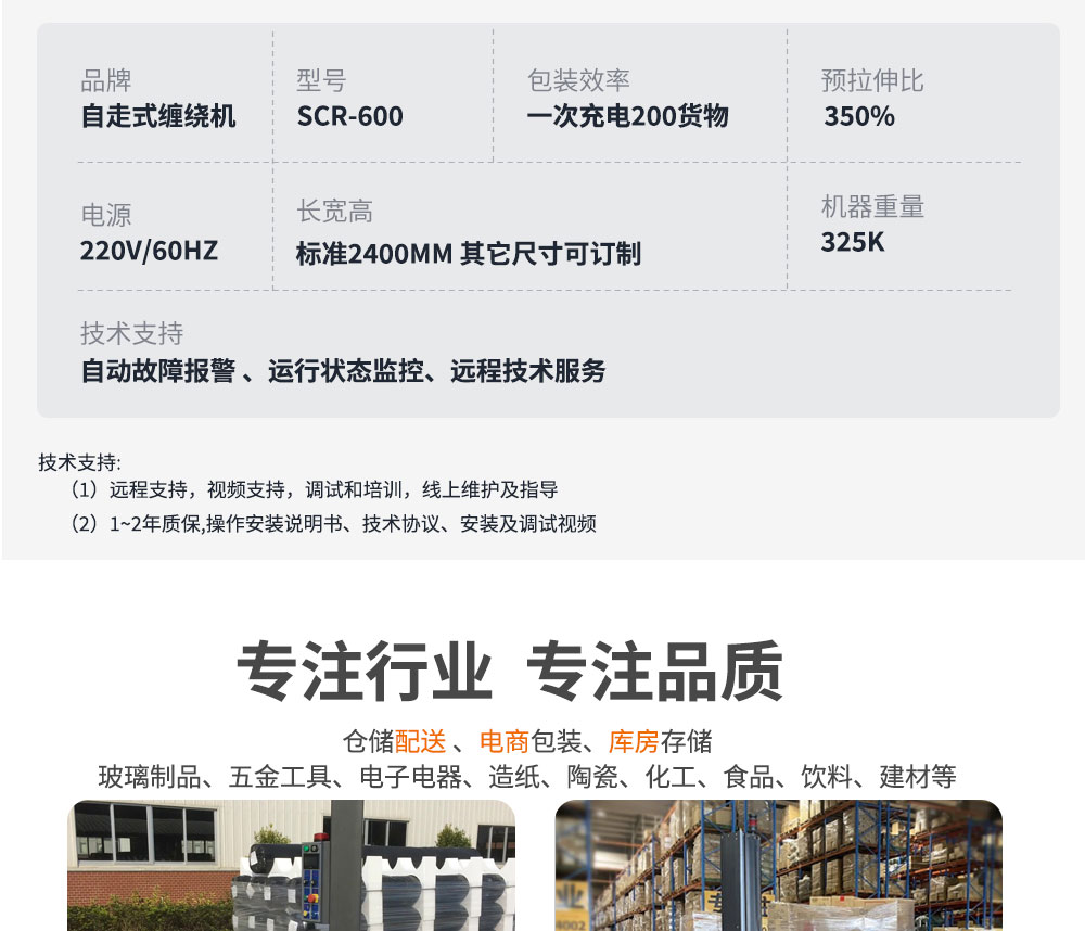 自走式纏繞機(jī)SCR-600不受貨物尺寸及重量限制,滿足各種不同形狀包裝物,自動(dòng)化程度高,